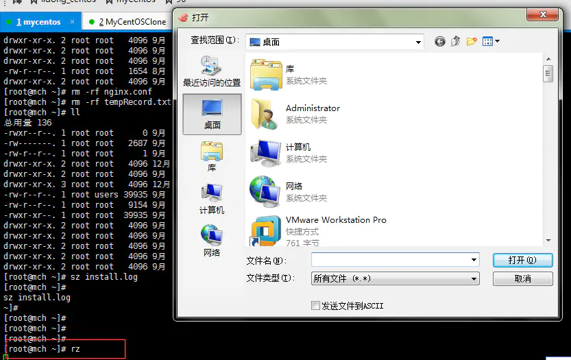 运行命令rz,即是接收文件(上传到Linux上),xshell就会弹出文件选择对话框,选好文件之后关闭对话框,文件就会上传到linux里的当前目录。也可以直接把要上传的文件拖到xshell上完成上传。如下图所示: