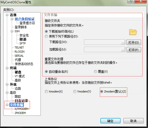 rz,sz是Linux/Unix同Windows进行ZModem文件传输的命令行工具,所以要在Xshell连接属性中,设置上传协议为Zmodem和接受的文件路径等,如下图所示: