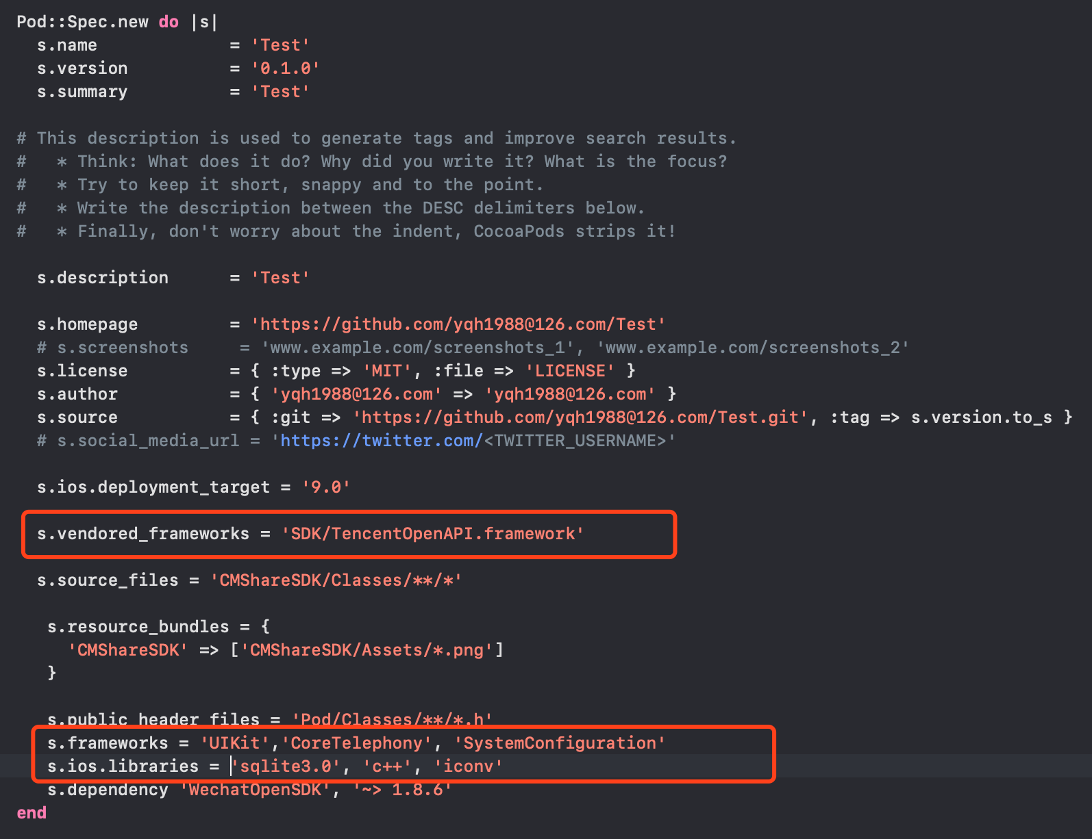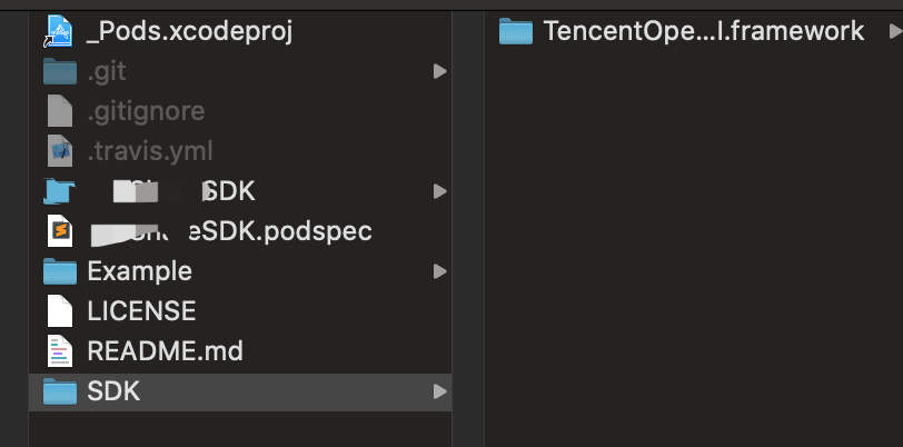 podspec中的“s.vendored_frameworks = 'SDK/TencentOpenAPI.framework'”指定framework;