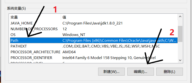 Path变量需要在已有的系统变量值中找到再增加变量值,变量值为==%JAVA_HOME%\bin==,引用前面的JAVA_HOME变量值指向的绝对路径是C:\Program Files\Java\jdk1.8.0_221\bin