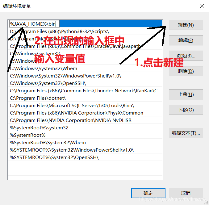 输入完成后点击确定,最后开始设置Path变量,这一步跟前面两个变量不一样,