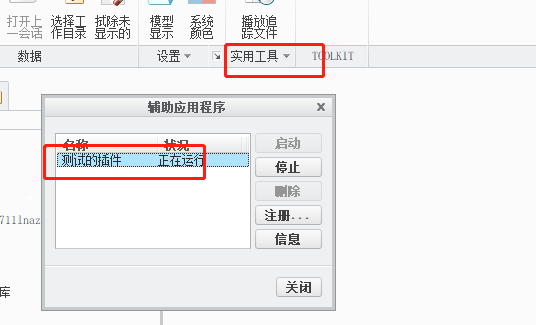 5.使用工具”>“辅助应用程序”,点击“注册”,选择之前写好的“protk.dat”文件,选中“测试的插件”,点击“启动”,关闭“辅助应用程序”的小框,可以在工具栏的“工具”中看到实现了上述程序的功能