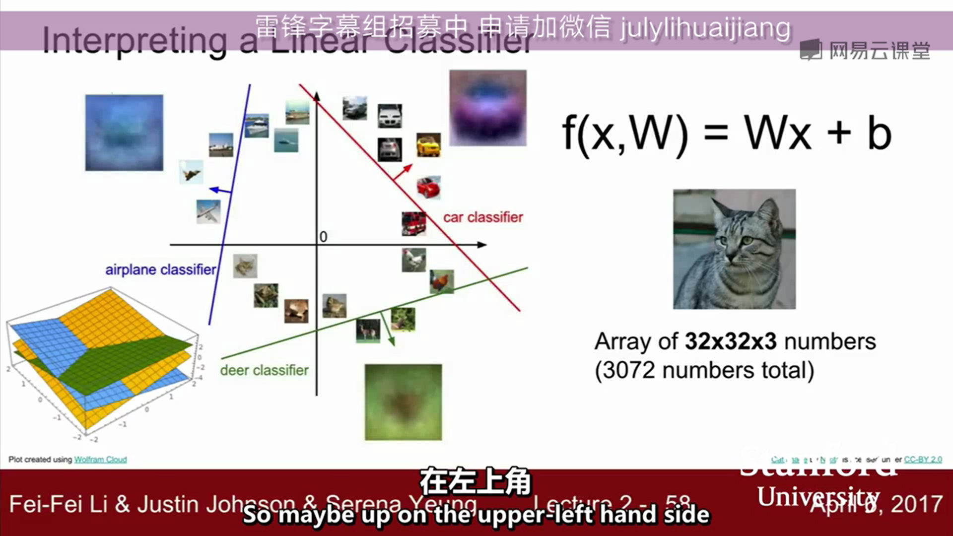 这里有个简单的例子关于线性分类器是如何运作的。这里的W和b就是我们想要训练得到的东西。