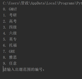 第四行的word_type_json[‘data’]因为词库种类在返回的字典的data键对应的值里面然后分别为各种词库标号并显示出来,给用户选择,效果如图: