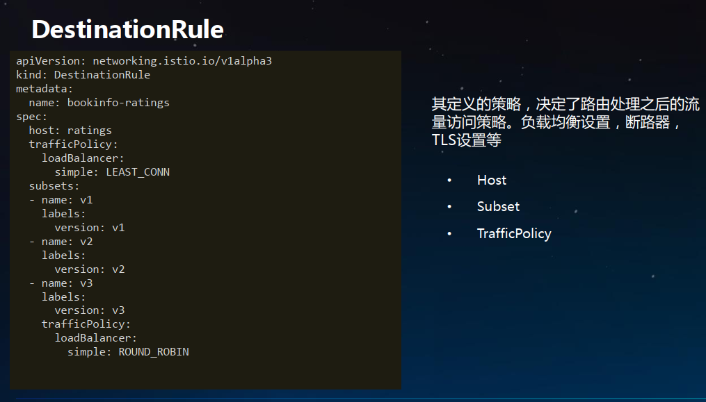 DestinationRule所定义的策略,决定了经过路由处理之后的流量的访问策略。简单的说就是定义流量如何路由。这些策略中可以定义负载均衡配置、连接池尺寸以及外部检测(用于在负载均衡池中对不健康主机进行识别和驱逐)配置。