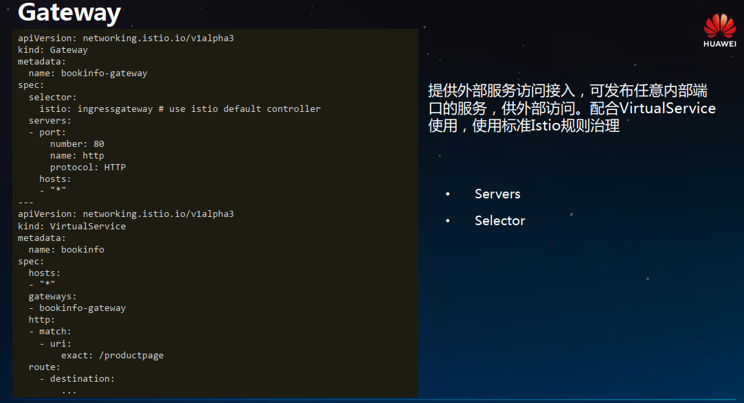 - Gateway:Gateway 描述了在网络边缘运行的负载均衡器,用于接收传入或传出的HTTP / TCP连接。