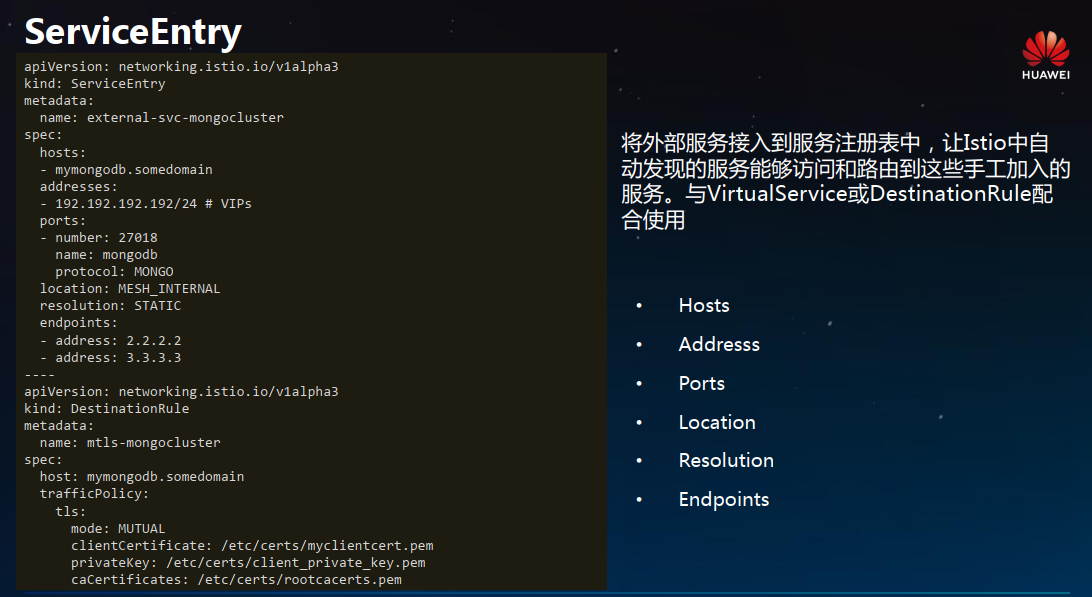ServiceEntry能够在 Istio 内部的服务注册表中加入额外的条目,从而让网格中自动发现的服务能够访问和路由到这些手工加入的服务。