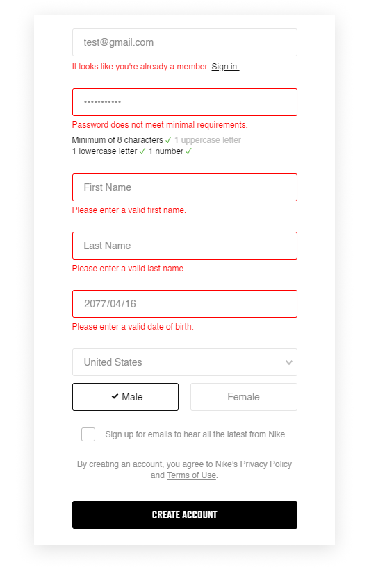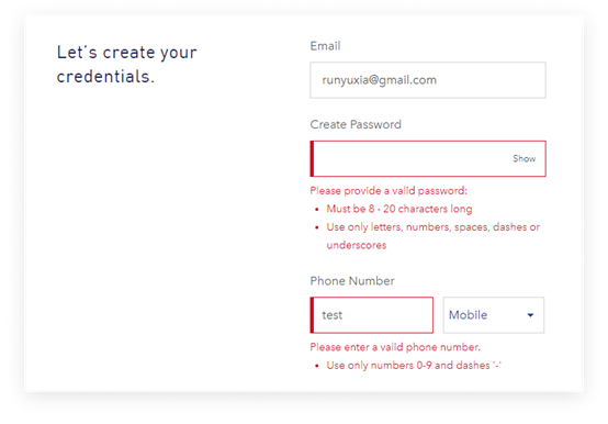错误验证是整个注册过程的最后一步。这就像审阅试卷,通过错误消息通知用户错误在哪里以及如何更正。一次显示所有错误消息,以便用户可以一次修复它们。如下图: