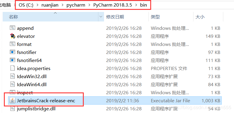 1、将下载的JetbrainsCrack-release-enc.jar破解补丁,放到pycharm的bin目录下