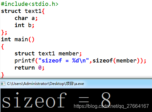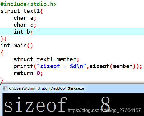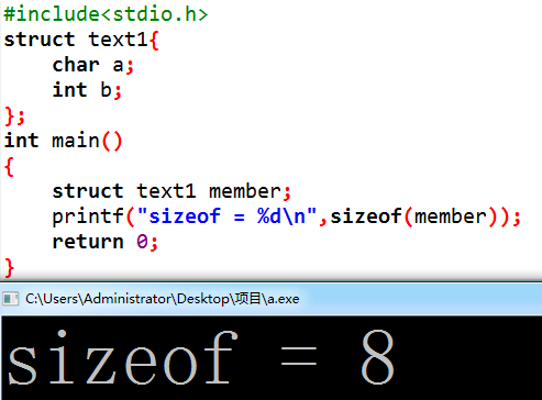 结果是8,将char于int类型补齐,即对char补齐了3个字节。结果是(1+3)+4=8.(注:所有计算试中斜体加粗数据为补齐用)