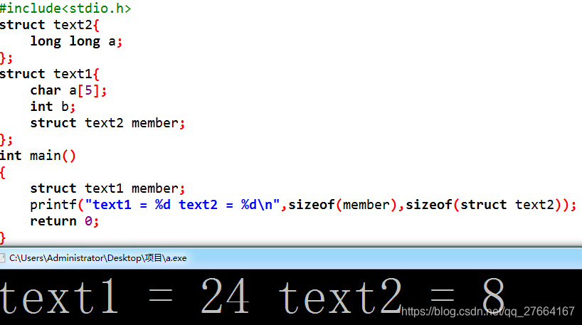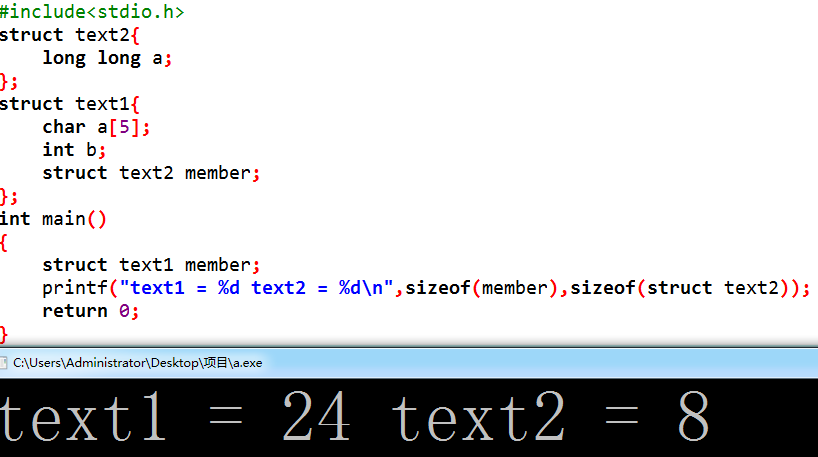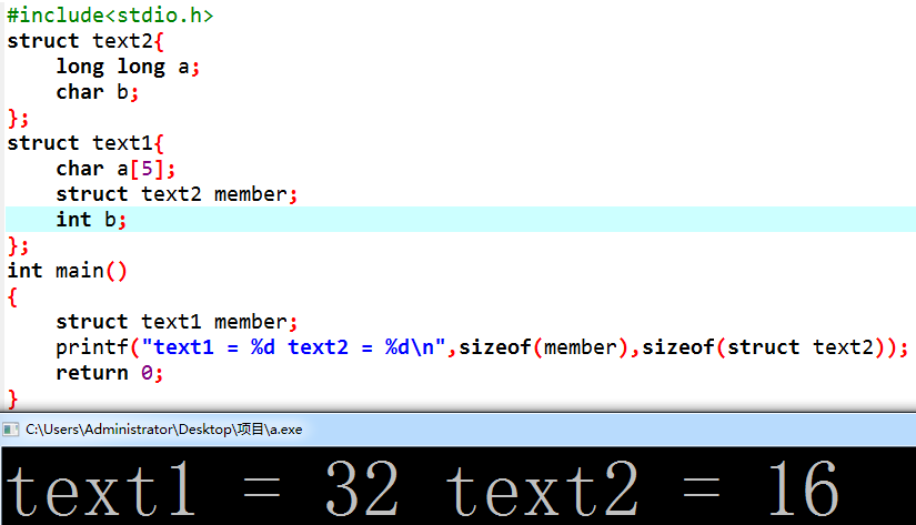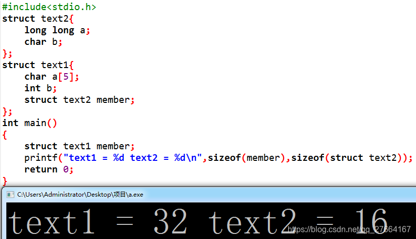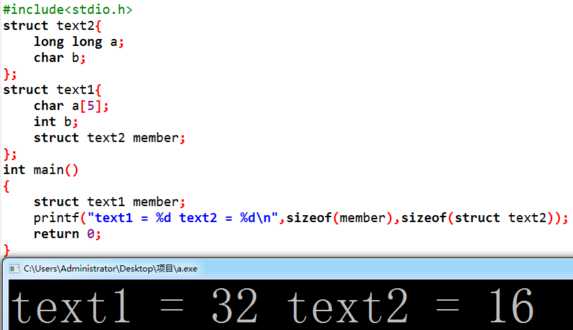 诶?为什么是32,结果不应该按照16补齐为48吗?还记得上面我们怎么对待数组的吗,对!拆开它!,对待结构体中的结构体也要这样,拆开它!把struct text2中所有的数据移到tex1中计算就好了,所以很明显最大的变量大小为8,结果为(5+3)+8+(1+4+3)=24,诶?好像不是32啊,怎么回事!看打印,text2=16,嗷,text2已经数据对齐了,那我们就算错了,结果应该是(5+3)+16+(4+4)=32。小结:所以当有结构体包含结构体应该怎么算大小呢,找出所有包含结构体中变量最大的那个一个,数据补齐就按照他的空间大小补齐,然后依次计算出包含的结构体大小,再对其他变量进行计算。
