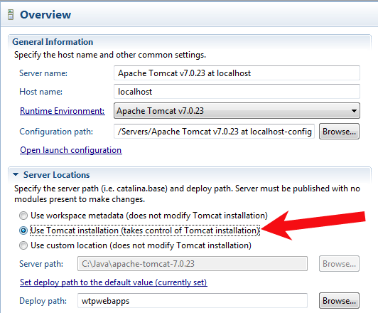 Again, the benefit is highly questionable. Do note that this way Eclipse will modify the Tomcat installation. So the Tomcat installation may not be reuseable across other IDEs/workspaces. You'd need to create a whole new Tomcat installation.