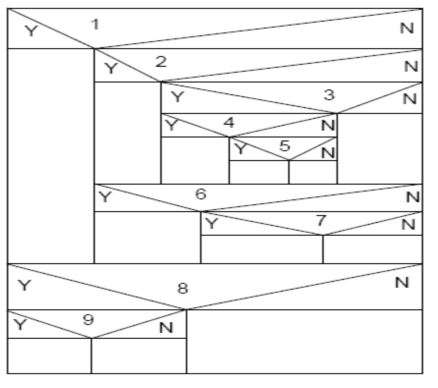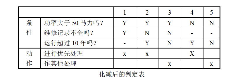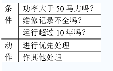 2、场景要求:”……对功率大于50马力的机器、维修记录不全或已运行10年以上的机器,应给予优先的维修处理……” 。这里假定,“维修记录不全”和“优先维修处理”均已在别处有更严格的定义 。请建立决策表。