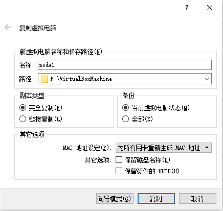 选中master虚拟机,右键复制,设置机器名为node1(拷贝第二个节点是为node2),虚拟机存储路径,为所有网卡重新生成MAC地址: