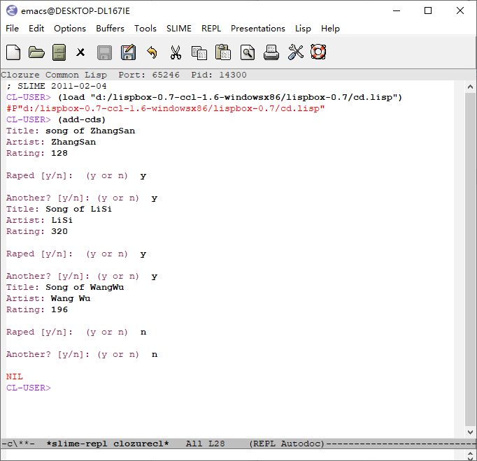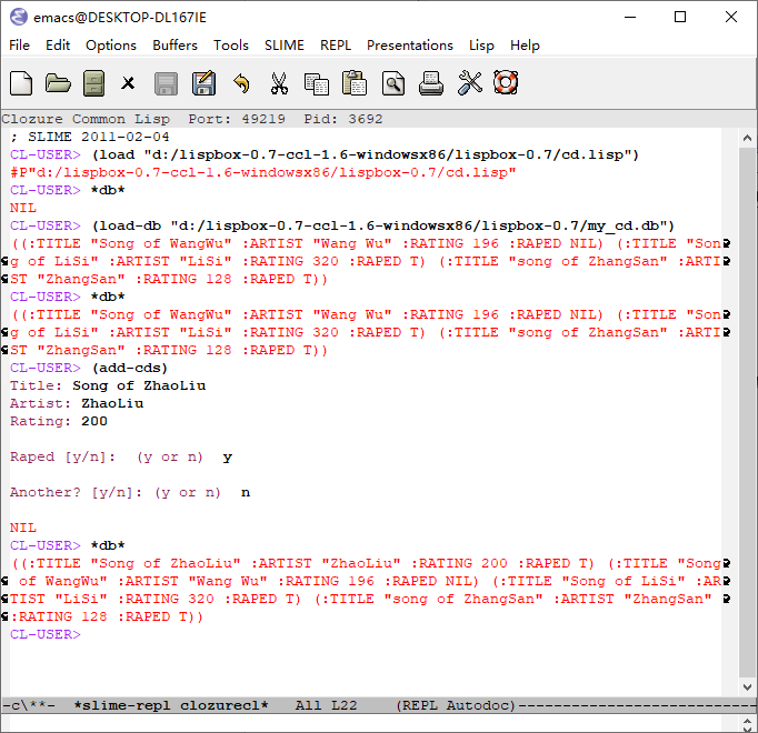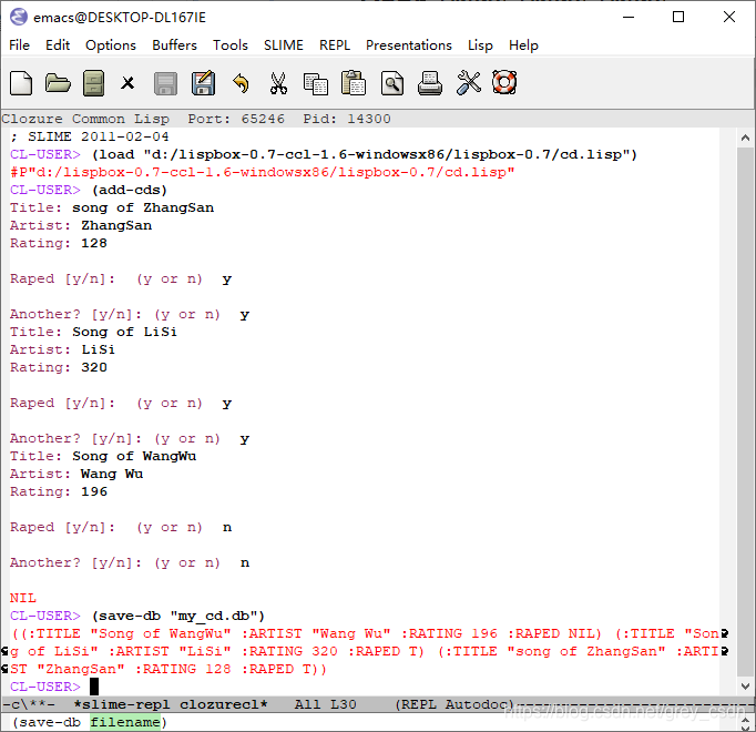 分析使用的例子来自于《实用common lisp编程》中的CD录入程序。或许是因为之前学习过其他的编程语言,我现在的编程语言的学习基本上都是在寻找之前已经掌握的编程语言的已知元素。当然,这只是第一步。当这一步过了之后,后面的提升则是针对这个编程语言的一些特性。