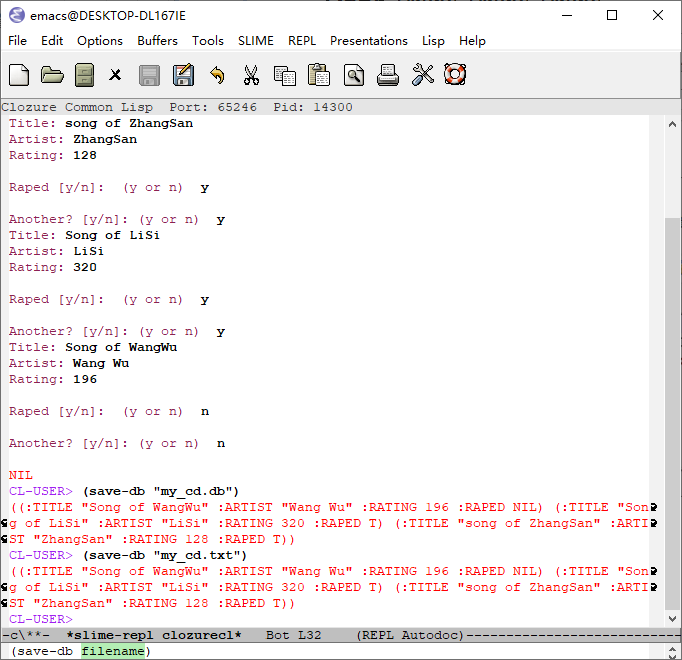 上面的操作,打开一个文件,设置输出属性。如果文件已经存在,那么进行覆盖。第二个类似句柄的宏with-standard-io-syntax作用于print,将其行为设置为默认。因此,上面的函数功能就是把全局量*db*的信息存储到filename指定的文件中。