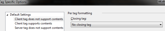 Under Default Settings -> Client tag does not support contents, set Closing tag to No closing tag.