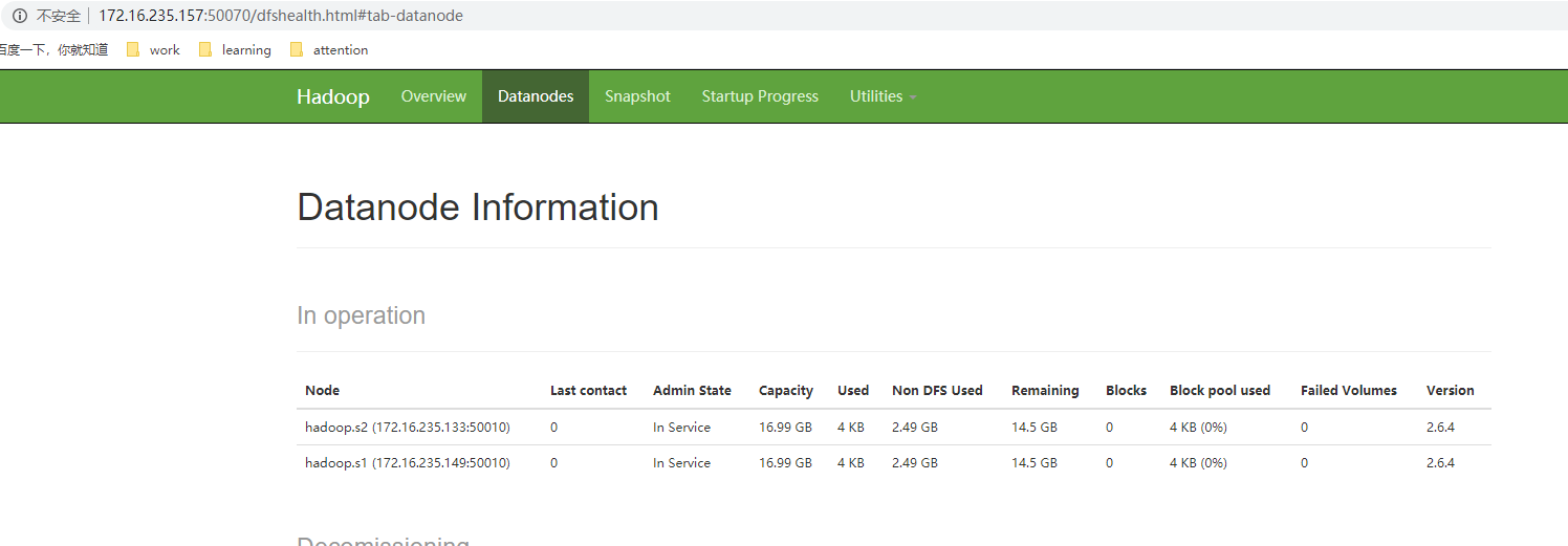 然后验证一下(/usr/shuyechao/hadoop2.6.5/sbin/start-all.sh),不用输密码了,启动成功后访问HDFS管理页面http://主节点IP:50070(注意关闭防火墙或在防火墙增加访问端口,否则访问不了),hadoop任务的管理页面http://主节点IP:8088