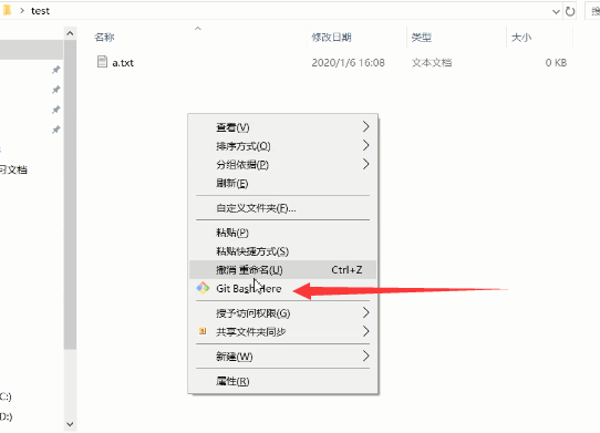 进入到test文件夹下(将该文件夹做成本地仓库)鼠标右击文件夹空白处点击窗口箭头处