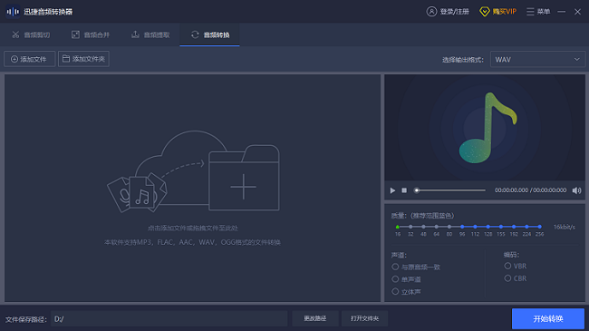 一款音频编辑软件,界面看着十分舒心,而且操作简洁明了,转换十分快捷。支持转换mp3、ogg、flac、wav等音频格式,转换效率也是一般的音频转换器无法比拟的,另外,此软件还支持音频剪切、音频合并、音频提取等编辑功能。