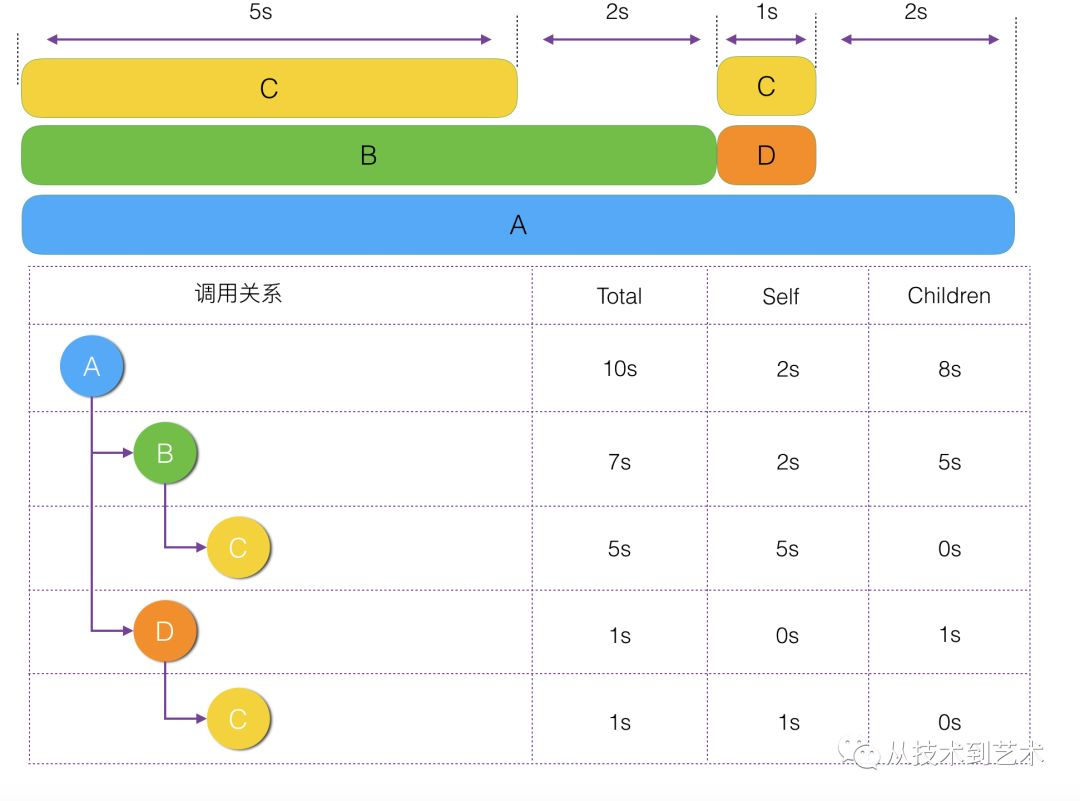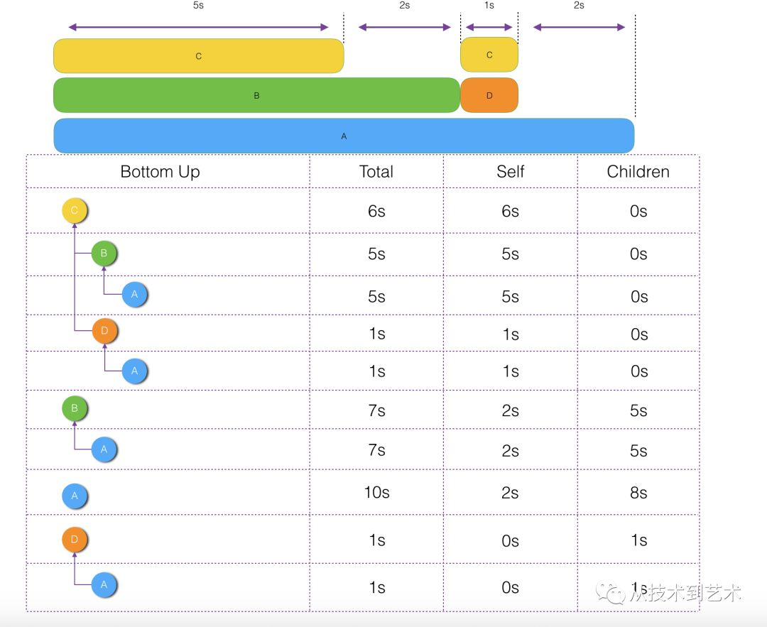 但是有一点需要特别注意,Self指的是树中根节点的Self耗时。举个栗子,比如上表中第二行,B的Self是5s而不是2s,原因就是这棵树是C的Bottom Up树,所以这里的Self是指C被B调用的自身耗时,而不是B的自身耗时,这里需要重点注意。
