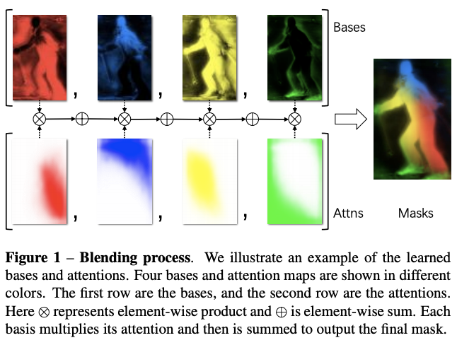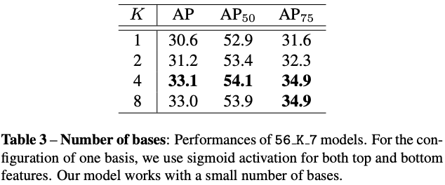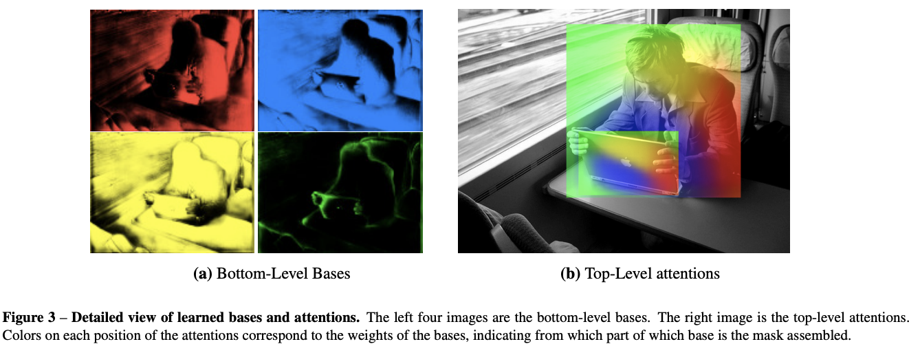 红蓝两个基底分别检测了目标的右上和左下部分点,黄色基底则检测了大概率在目标上的点(semantic mask),而绿色基底则激活了物体的边界,position-sensitive features有助于进行实例级别的分割,而semantic mask则可以对postion-sensitive进行补充,让最后的结果更加顺滑。由于学习到了更多准确的特征,BlendMask使用了比YOLACT和FCIS少很多的基底纬度(4 vs. 32 vs. 49)
