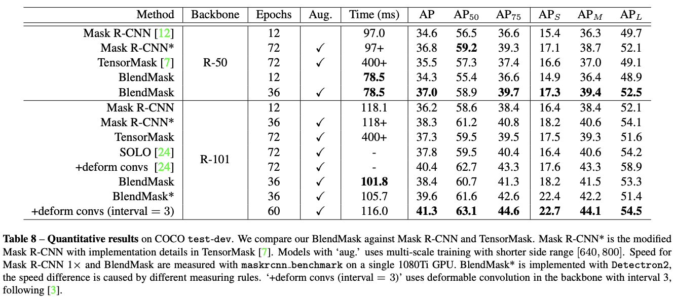 - BlendMask的准确率和速度比Mask R-CNN要好,且mask mAP比最好的全卷积实例分割网络Tensor-Mask要高1.1