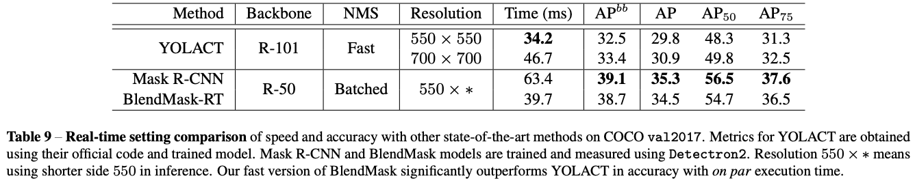 为了跟YOLACT对比,论文改造了一个紧凑版的BlendMask-RT: 1) 减少prediction head的卷积数 2) 合并classification tower和box tower 3) 使用Proto-FPN并去掉P7。从结果来看,BlendMask-RT比YOLACT快7ms且高3.3AP