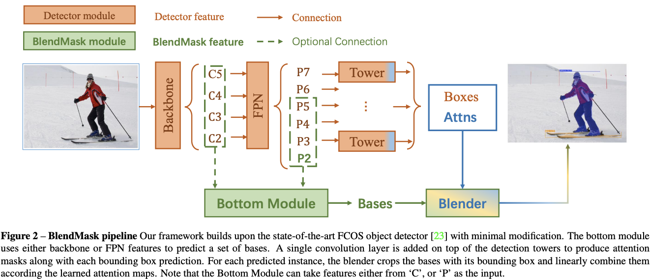 BlendMask包含检测网络和mask分支,mask分支包含3个部分,bottom module用于预测score maps,top layer用于预测实例的attentions,blender module用于整合分数以及attentions,整体的架构如图2所示