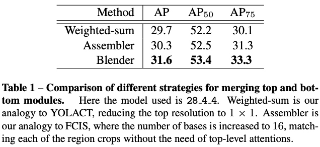 - 提出了proposal-based的instance mask合并方法,blender,在COCO上对比YOLACT和FCIS的合并方法分别提升了1.9和1.3mAP