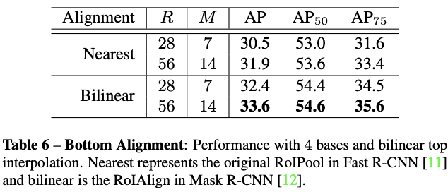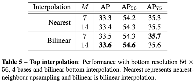 而对bottom-level score maps进行插值时双线性比最近邻高2AP