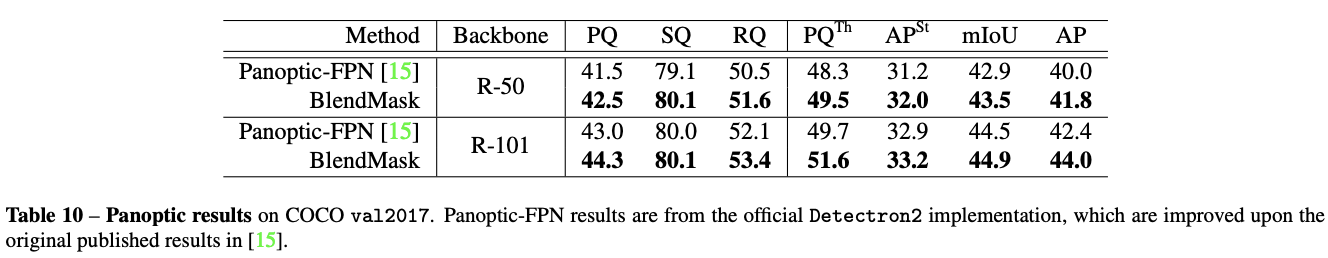 - 由于bottom模块能同时分割多种物体,BlendMask可直接用于全景分割