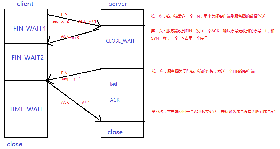 关闭连接的过程为四次挥手,由于TCP的全双工的通讯,所以每个方向都必须单独进行关闭。