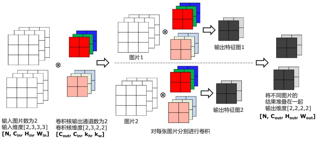 在卷积神经网络的计算中,通常将多个样本放在一起形成一个mini-batch进行批量操作,即输入数据的维度是。由于会对每张图片使用同样的卷积核进行卷积操作,卷积核的维度与上面多输出通道的情况一样,仍然是,输出特征图的维度是,如 图9 所示。
