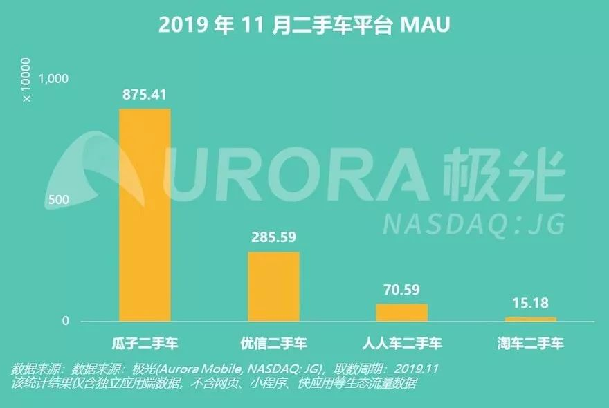 根据极光iAPP发布的二手车平台APP监测数据,11月瓜子二手车MAU(月活跃用户量)以875.41万位列第一,而第二到四名之和为371.36万;渗透率方面,瓜子以1.07%居于第一,第二到四名的渗透率分别为0.51%、0.20%、0.11%。