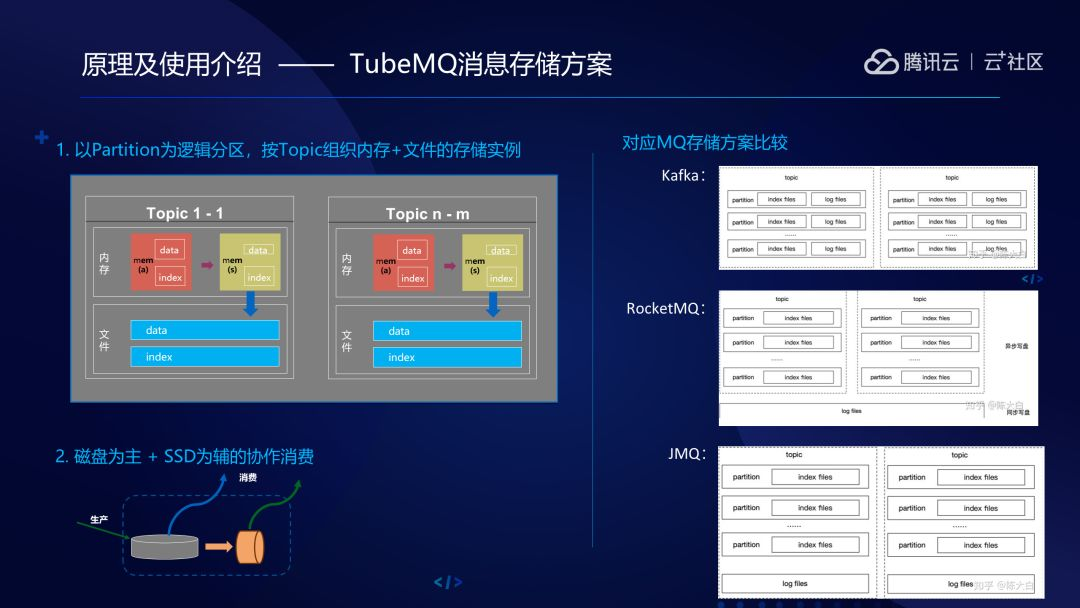 TubeMQ是怎样呢?TubeMQ是一个Topic一个数据文件,不同的Topic有不同的文件,我们没有Partition。我们都是按Topic来定义存储单元的,一个数据文件 + 一个索引文件。大家可以去分析一下,它们是各有特点,不同的场景下的表现特征是不一样的,包括你的硬件场景,其实还是有很大差异的。