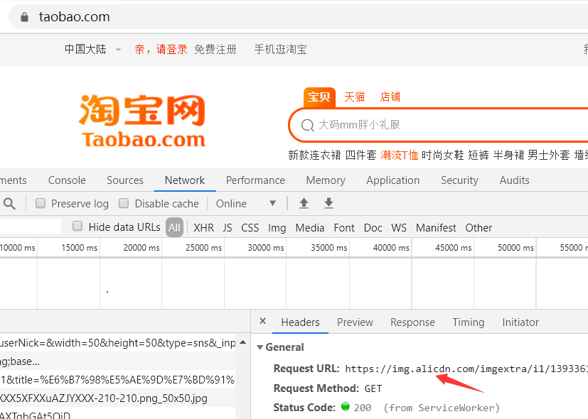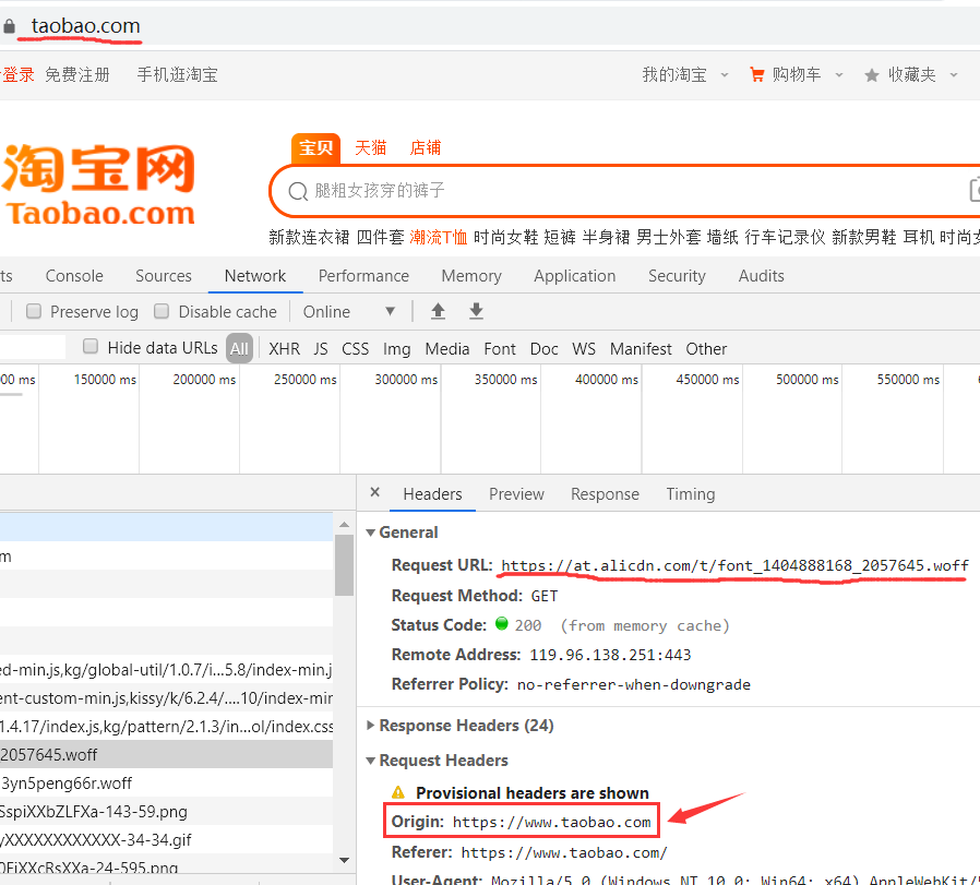 我们先来看一看浏览器的请求头是在哪里携带来源网址进行询问的,还是以淘宝为例,我们在淘宝页面向访问另一个域名下的内容,就会在请求头中的Origin中修改当前网址,去询问想要访问的服务器,如下: