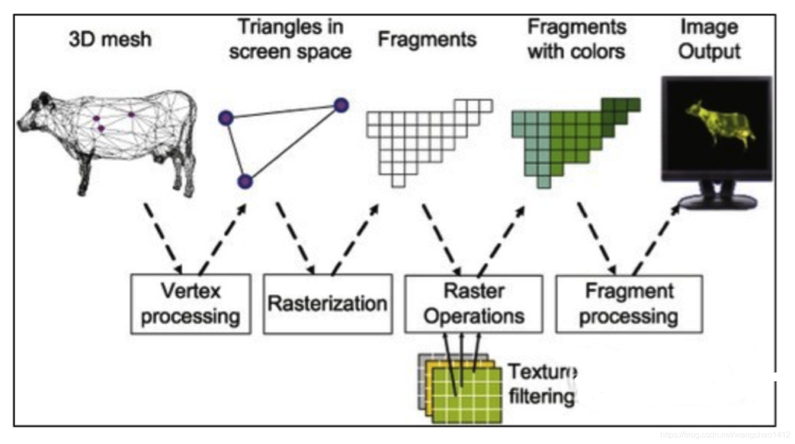 OpenGL的绘制首先需要经过顶点着色器,进行光栅化(光栅化就是把顶点坐标连接后,途径的像素点进行关联),然后用片元着色绘制预览画面的像素值。