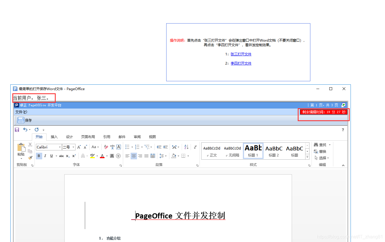 <span style=" color:Red;">操作说明:</span><span>首先点击“张三打开文件”会在弹出窗口中打开Word文档(不要关闭窗口),<br />再点击“李四打开文件”,看并发控制效果。</span><br /><br />