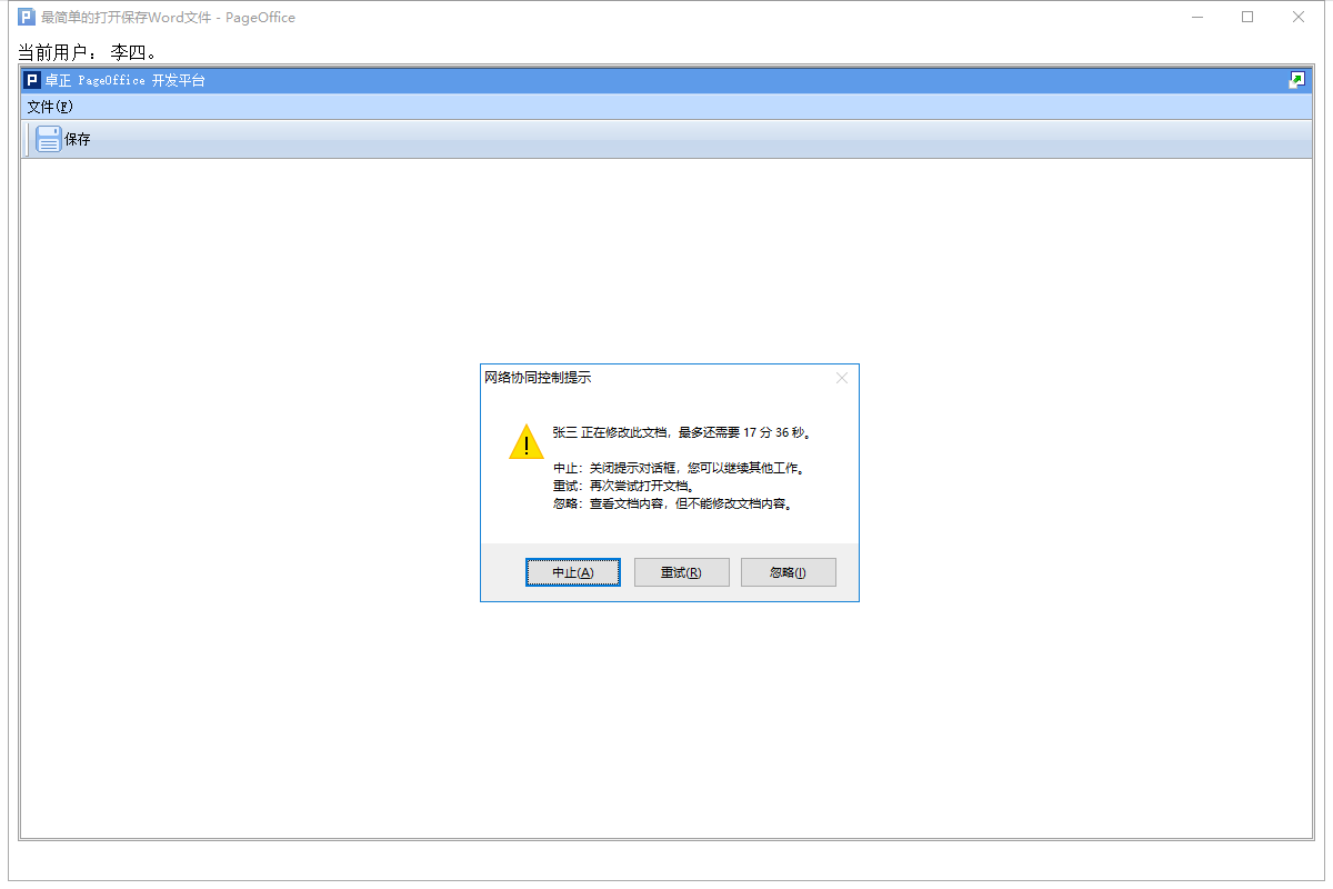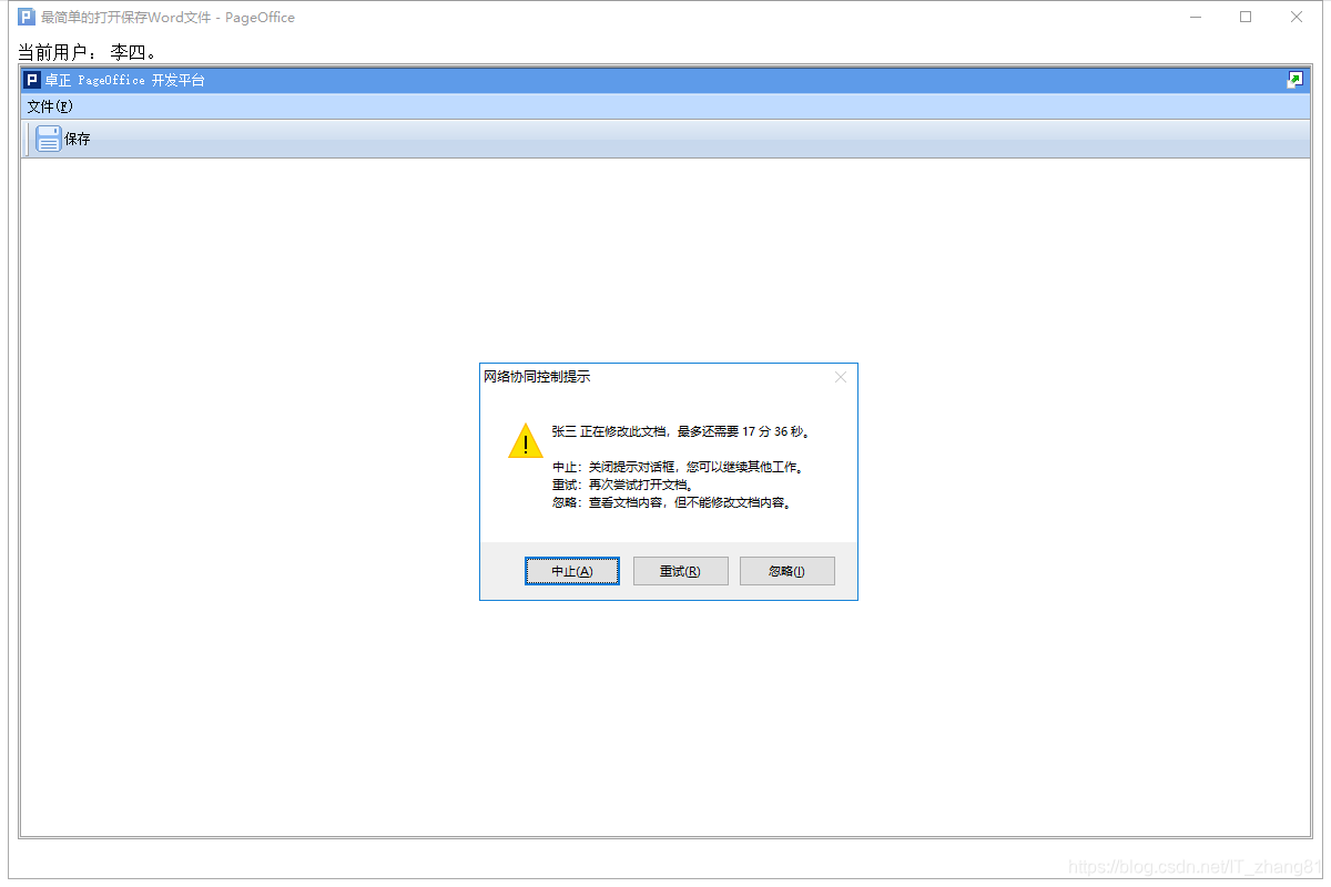 此时,会提示张三正在修改,如果点击忽略,依然可以打开文档,并且是只读状态。