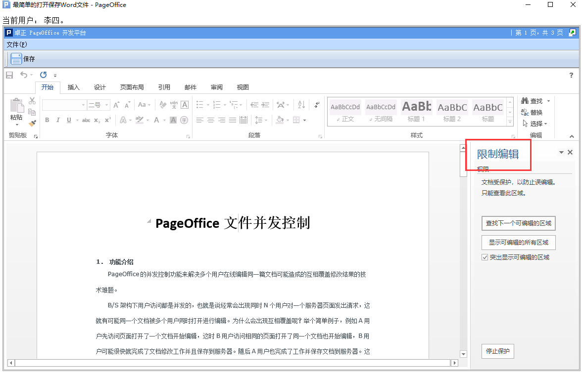 注意:如果需要更丰富的功能,大家可以去pageoffice官网下载示例代码直接将samples4文件夹扔到Tomcat的webapps下,启动Tomcat,浏览器访问http://localhost:8080/Samples4/index.html,查看示例中的下面一个链接,直接看samples4文件夹下ConcurrencyCtrl文件夹里面的代码.