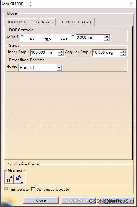 2.左侧浏览树中分别点选机器人KR100-P与机器人行走轴KL1500_2,Available types后点选“End of arm tooling”选项,即行走轴作为机器人的外部轴。