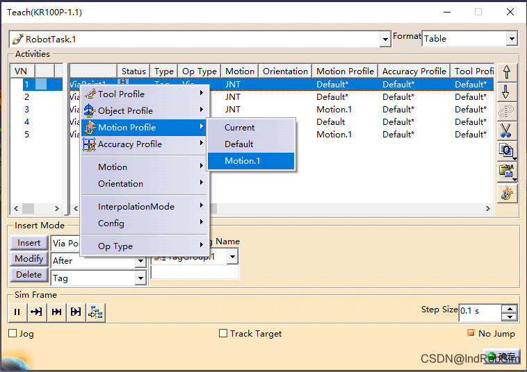 4.当然,这里也可以对机器人以及行走轴的速度进行创建设置。点击Robot Controller工具条中的“Motion Profile”命令按钮,然后点击左侧浏览树中的机器人KR100-P,在打开的Motion Profile对话框中可以对机器人运行速度进行创建。