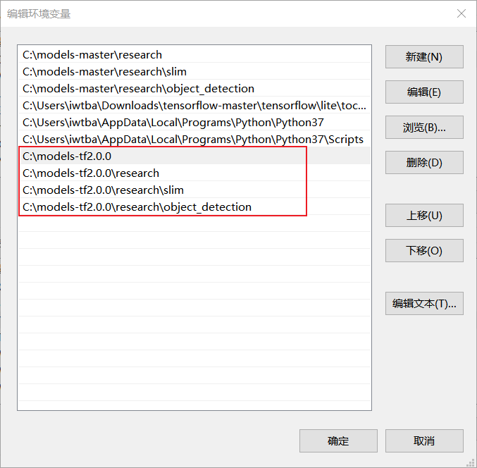 5. 把这些路径\models, \models\research, \models\research\slim ,\models\research\object_detection添加到系统环境变量里。ps:我的环境名称是tensorflow2.x,下载的models文件夹命名为models-tf2.0.0.
