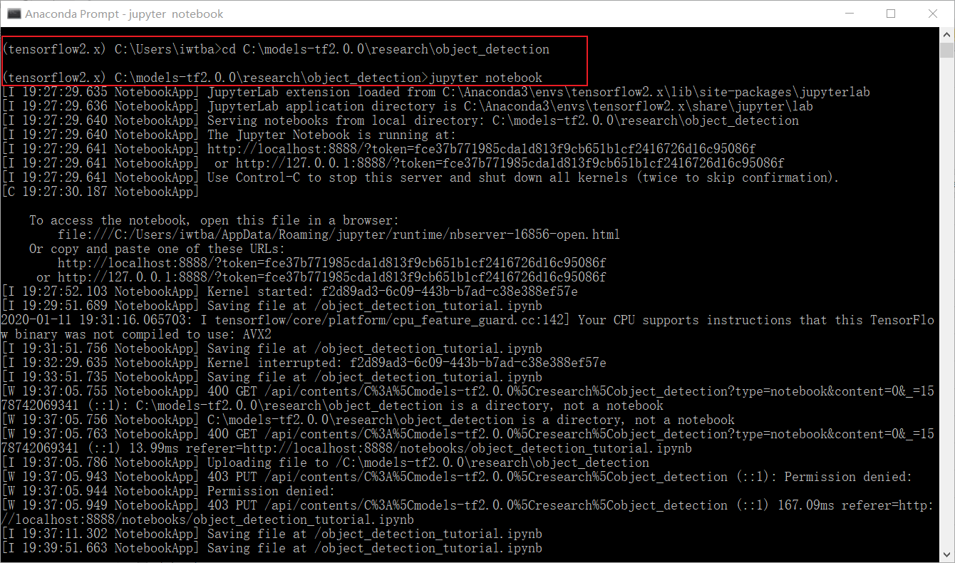 7. 通过cd进入到object_detection文件夹下面,因为我们要运行的object_detection_tutorial.ipynb就在这里。再输入jupyter notebook,过一会儿浏览器就会自动打开jupyter notebook啦!