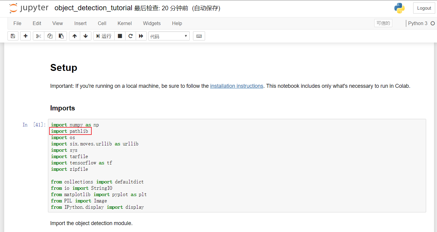 9.1 开头部分改成如下所示,因为我们已经确认安装好tf2.0了,不需要pycocotools,已经进入object detection工作目录了,所以一些代码可以删除掉,但有一句代码不能删,就是import pathlib,所以我把它移到下面的cell了。