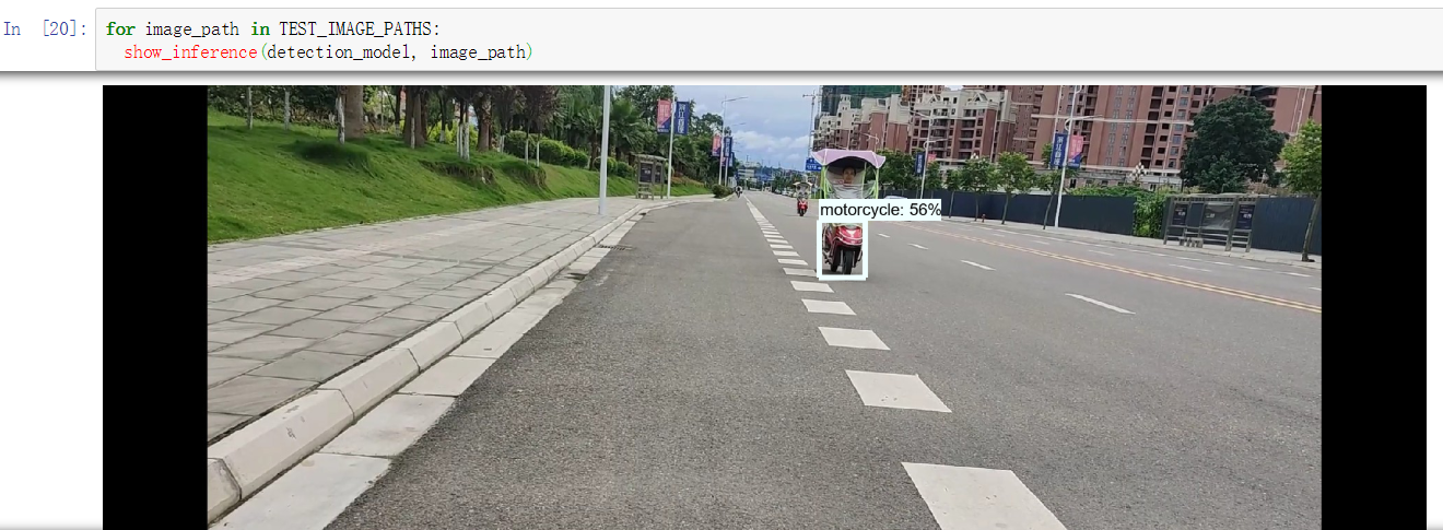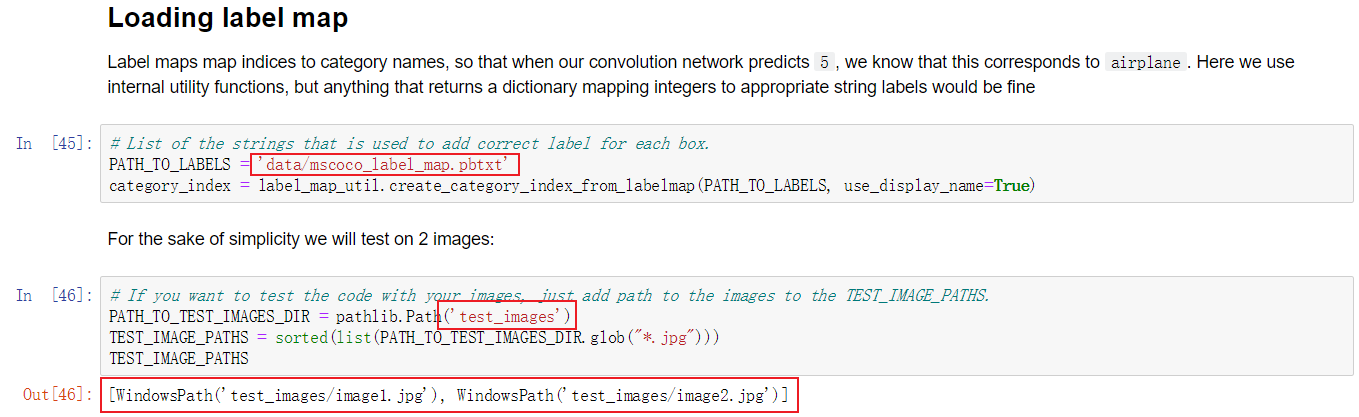 9.2 因为我们已经在object detection目录下面了,所以要把下图两个红圈部分的路径改成下图所示的样子,否则kernel会die。我们要检测的图片放在object_detection/test_images文件夹里面。正常运行后,第三个红圈的位置会显示检测到待会儿要识别的图片image1和image2。