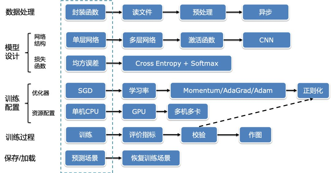 下图概括了本次课程的主要授课知识点,课程内容涵盖深度学习的数据处理、模型设计、模型训练、模型优化等部分,另外扩展了异步数据读取,分布式训练、恢复训练等知识点。