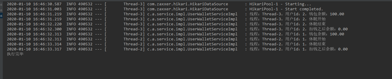 log.info("线程:{},用户id:{},扣钱之后余额:{}", threadName, userId, wallet.getBalance());