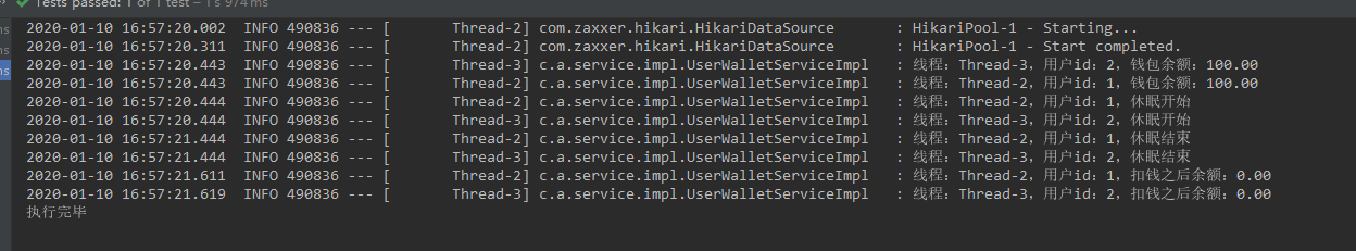 与第一个单元测试的差别仅仅只是修改了一个线程的用户id,接着再service中让程序休眠1秒,这样我们可以更直观的看结果